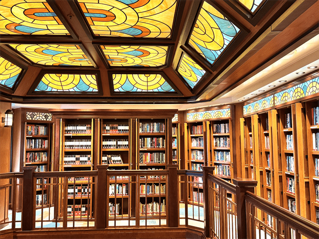 2階建ての本格的なライブラリー(図書室)では、読書はもちろん、PC作業もはかどります。螺旋階段と天井の組み合わせが絵になるスポット。本棚には日本の本も置かれていて、スタッフが日本の書籍がある場所を教えてくれました。