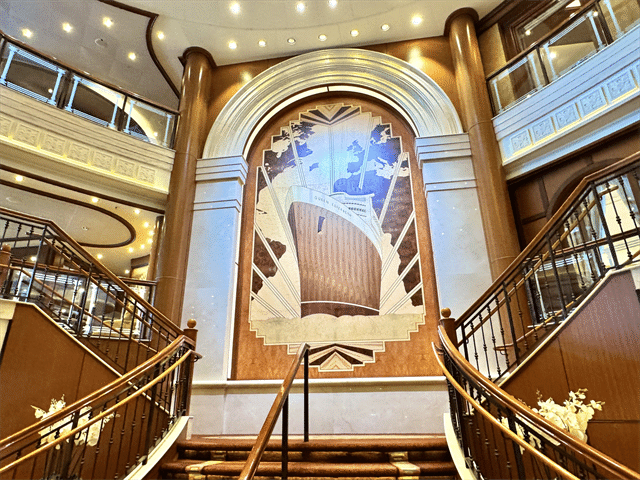 クイーン・エリザベスに乗船したら、絶対写真を撮りたいスポットがこちら! 初代クイーン・エリザベスをモチーフにした寄木細工が印象的な、グランド・ロビーへと続く大階段です。吹き抜けの壮麗な空間とラグジュアリーな雰囲気は、映画「タイタニック」の世界を彷彿とさせます。
