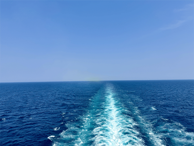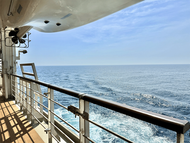 船の後方から広がる航跡と水平線は、ぼうっと眺めているだけで癒やされます。そして、「今、船に乗ってるんだ!」と実感するひとときです。