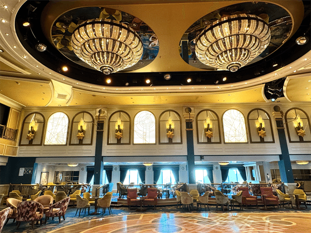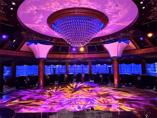 昼と夜ではまたガラリと雰囲気が変わるのもクイーンズ・ルームの特徴。夜は多くの人が音楽に合わせてダンスを楽しんでいました。そこには、衣装をバッチリきめた日本人の乗船客が、社交ダンスを楽しんでいる姿も。こういう場で躊躇なく踊れたら素敵だなぁと思ったのでした。