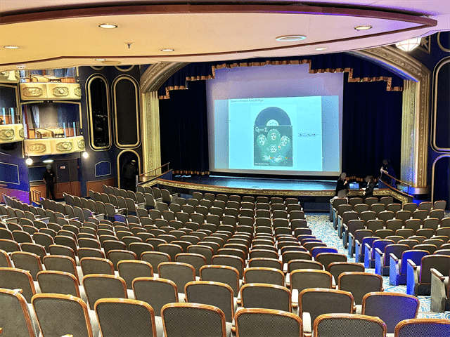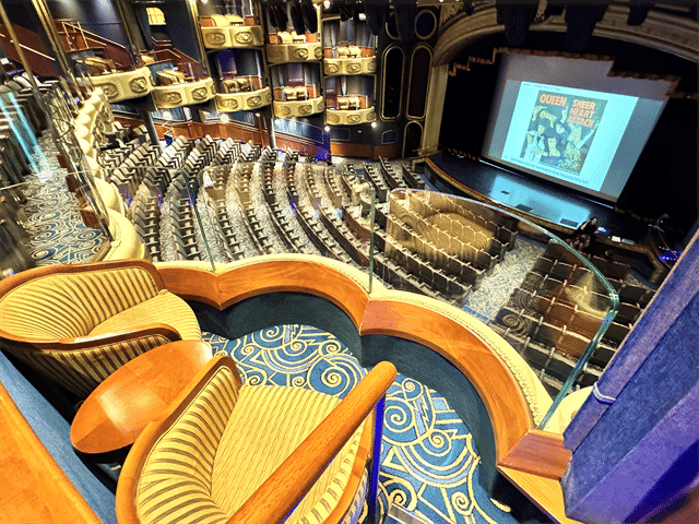 毎日さまざまなショーが催されるクラシカルな劇場です。800人も収容できるシアターは、船内にあるとは思えない規模感! ボックス席(有料)もあり、まるでオペラ鑑賞のような雰囲気も味わえます。