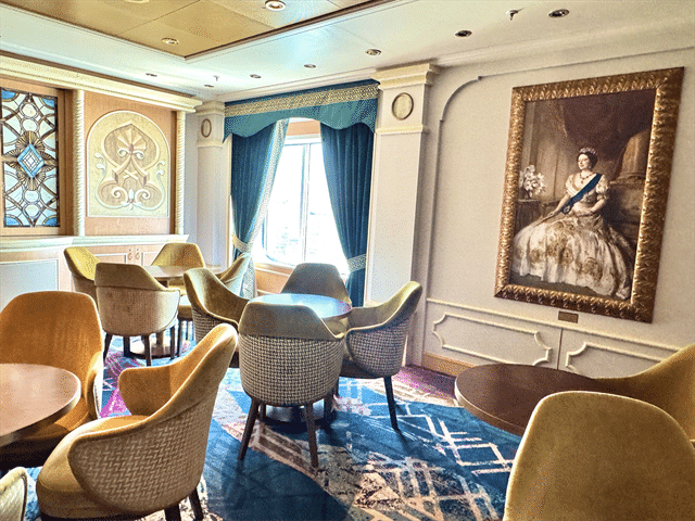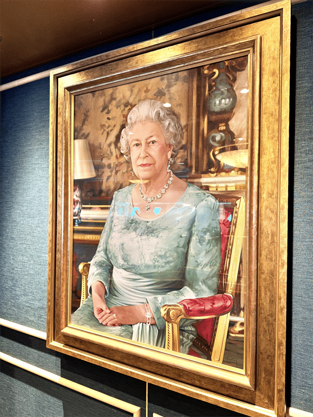 船内にはエリザベス女王の肖像画が飾られています。乗船中、こちらの肖像画と一緒に写真を撮る人を多く見かけました。女王のお顔に船内の照明が反射しがちなので、角度を確認して写真を撮るといいですよ。