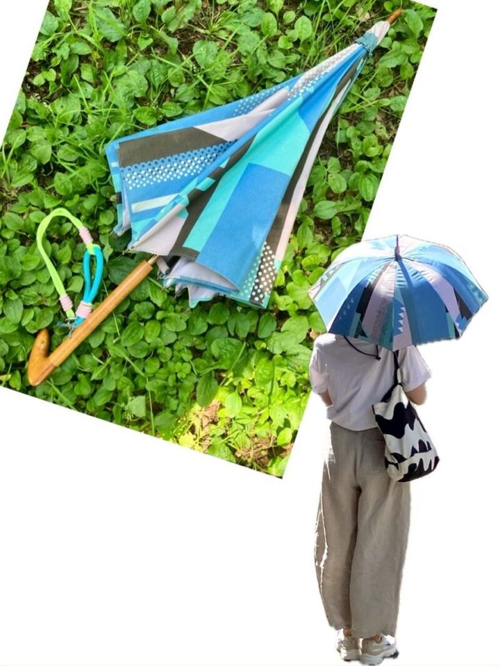 もうひとつ長傘の日傘として愛用しているのが、ブルー系の色柄が印象的なcocca(コッカ)の日傘。coccaはオリジナル生地やデザイナーとのコラボ生地を扱うブランドで、その生地を使って作られた傘も素敵なんです。こちらの傘も夏のシンプルな装いに涼しげな色どりを添えてくれます。