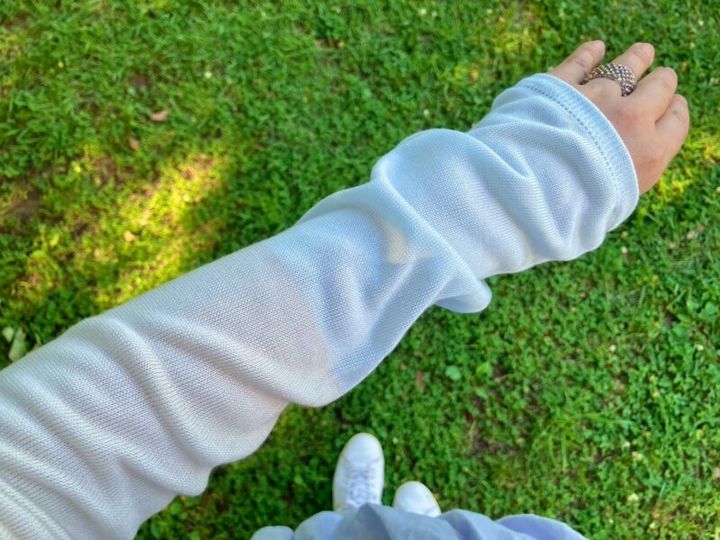 今年追加で新調したのは「ひんやりアームカバー」というタイプの物。内側に接触冷感糸が使われているため、ひんやり気持ちいい~。シルク混でテロンと柔らかい肌触りがとても気持ちがいいです。上質でおしゃれなカーディガンを羽織っている様な雰囲気で、カジュアルなTシャツなどにも馴染みやすくおすすめです。
