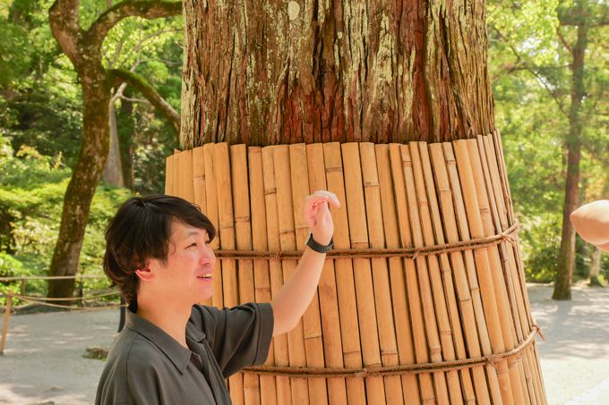 寺内:さて、こちらをご覧ください。道の真ん中に木があることに違和感があるかもしれないけど、大切な神域の樹木なんです。そして、この巻かれている竹はなんだって話ですが、この木にご利益があると思って、こそいじゃう人がいるから巻いています。だけど僕みたいに背が高い人は上からこそいじゃうから要注意です!