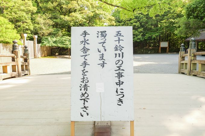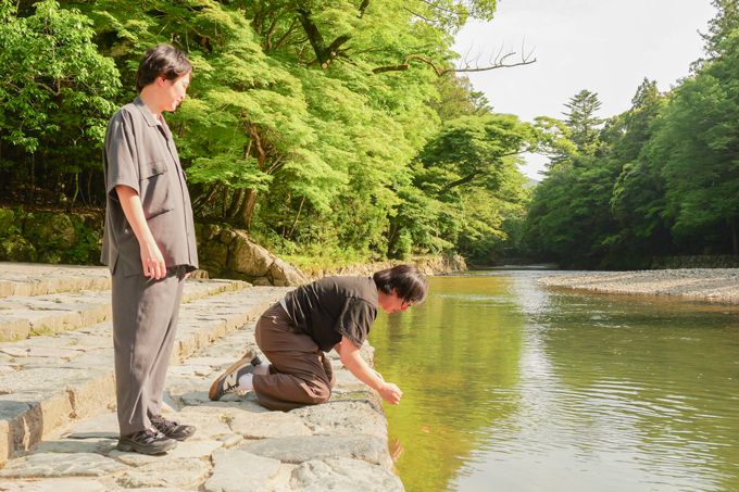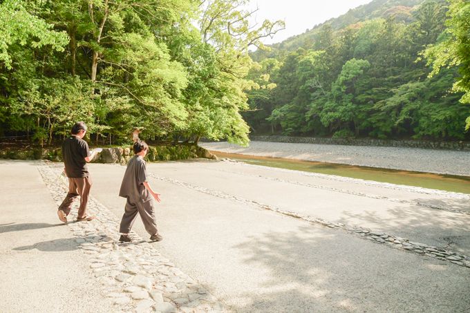 寺内:欲深いな! 全板踏まなくて大丈夫だから(笑)。五十鈴川は、御正宮に参拝する前に心身を清める場所です。徳川綱吉の生母、桂昌院が寄進したと言われている石畳を敷き詰めた御手洗場(みたらしば)が見えますね。ここでは手水舎と同様にお清めができます。