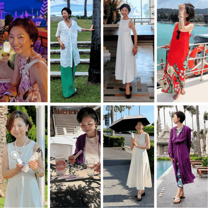 「機内やホテルの冷房対策で羽織りものを2着、長時間の移動でも『座りやすい』『疲れにくい』『シワにならない』素材のワンピース、『軽い』『かさばらない』『すぐ乾く』ポリエステルレーヨン混のワンピースを持って行きました」というりささん。 普通の服に加えて、リゾート地では水着も活用できるのだそう。「インナーでも使える水着×パンツ×コットンの羽織りものがあれば、ホテル内の食事も、ミーティングも、プールサイドでも対応できて便利です」