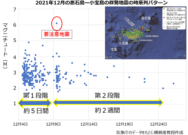 過去3回の地震では、地震のピークは2回ありました。群発地震を起こしている2本の断層のうち、まず南北どちらかの断層面が動いて第1段階の群発地震が起き、それがもう一方の断層面に伝播して、もう一方の断層面が動いているとみられます。上の図は2021年12月の時系列データをグラフにしたものですが、他の時期に起きた群発地震でも、第2段階では「要注意地震」から始まっています。