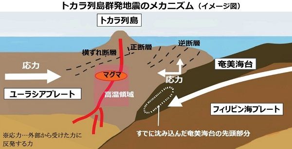 トカラ列島は火山の噴火でできた島で、海底には高温のマグマがあります。ユーラシアプレート側の地殻は深くなるほどマグマに温められ、伸び縮みしやすく、割れにくくなっているとみられます。逆に、浅い部分はマグマから遠く、あまり温められないため、岩盤は固く割れやすい。群発地震の規模(マグニチュード=M)が、震源が深くなるほど小さくなっているのは、このためとみられます。
