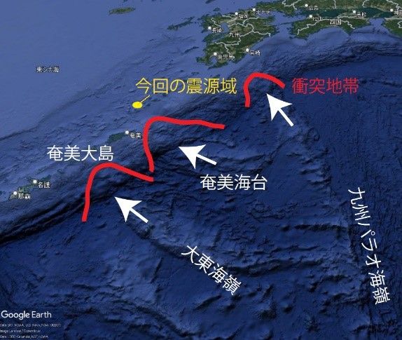 それは、この海域でもぐり込むフィリピン海プレートが、巨大な海底山脈からなる大東海嶺(東西30~50km、南北600~700km、海底面からの高さ3~4km)や、巨大な海底台地の奄美海台(東西100~120km、南北250km、海底面からの高さ約4km)を乗せているからとみられています。この海域ではフィリピン海プレートが沈み込む際に、海台がユーラシアプレート側の地殻にぶつかります。分かりやすく言うと、トカラ列島近海は、ほぼ九州サイズの大型ダンプカーが100万年くらい衝突し続けているような特殊な海域なのです。