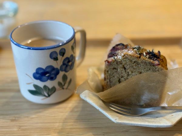 今回は苺とほうじ茶のヴィーガンケーキ(540円)、飲み物はカフェオレを注文しました。 ケーキは日によってメニューが変わりますので、気分で注文してもいいですね。