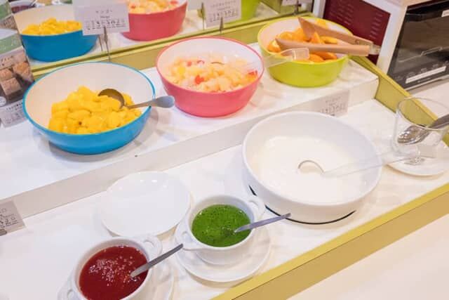 ミックスフルーツやヨーグルト、ジャムなどが並ぶデザートコーナー。土日ならクロッフに添えても楽しめます。