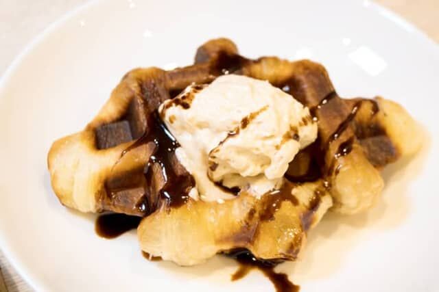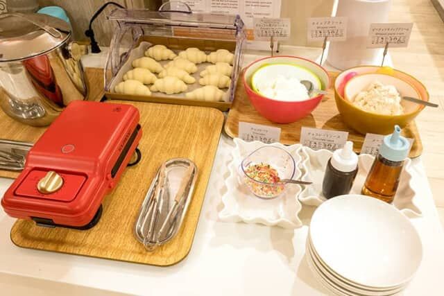週末利用の家族に喜ばれるのが、セルフで作るクロッフル(クロワッサンの生地で作るワッフル)。クロワッサン生地をワッフルメーカーにはさんで4分ほど焼き上げます。ホイップクリームやメープルシロップ、チョコレートソースなどが用意され、フルーツを添えればバージョンアップを楽しめます。
