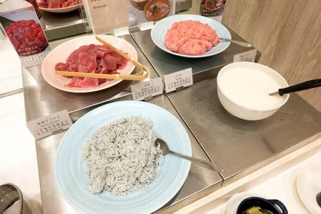 海鮮丼コーナーには季節に合わせて旬の具材をそろえます。この日はキハダマグロやねぎとろ、釜揚げしらす、長芋とろろが並び、好きな具材を盛り付けて海鮮丼を作れます。6月中旬からは釜揚げしらすにかわり千葉県発祥の郷土料理「なめろう」が登場。千葉県銚子市で創業したヒゲタ醤油も用意され、ご当地の味付けで海鮮を楽しめます。