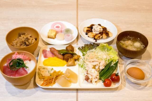 ビュッフェスタイルの朝食は、海鮮丼の具をはじめ、ご当地料理や和洋のお惣菜、豊富なサラダやブランド卵、デザートなどが並び、料理の味付けもよく、ビジネスホテルとしては満足度の高い朝食です。