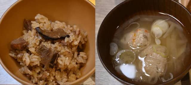 この日の日替わり炊き込みご飯は千葉県富津市のB級グルメ「はかりめ丼」。当市では穴子を「はかりめ」と呼び、通常は煮穴子をのせた穴子丼ですが、こちらでは椎茸などと共に混ぜご飯にアレンジ。さらに、日替わりで用意される九十九里周辺の郷土料理「イワシの団子汁」も、イワシのつみれが風味豊か。もう一方の日替わりは県産のシジミを使ったシジミ汁。利根川周辺の郷土料理として親しまれています。