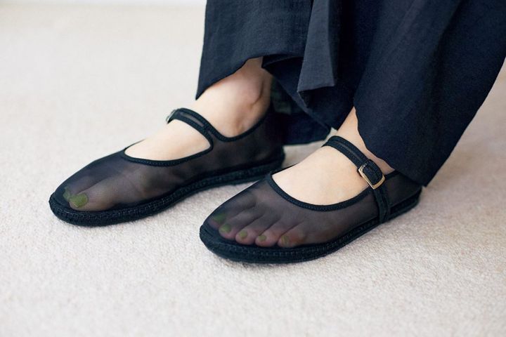 ほんのり透けるシューシャの靴で、黒でも軽やかな印象に。