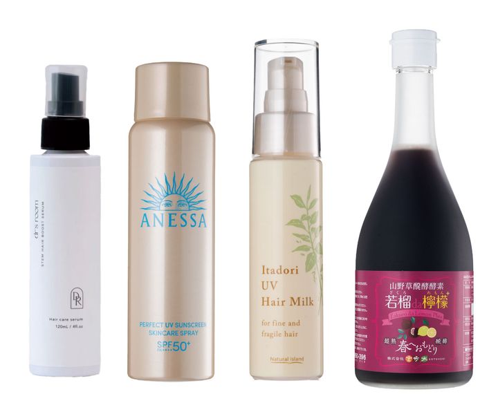 髪のエイジングにつながる紫外線ダメージは徹底カット。頭皮にはアネッサのUVカットスプレー、髪にはイタドリUVヘアミルクで完璧。