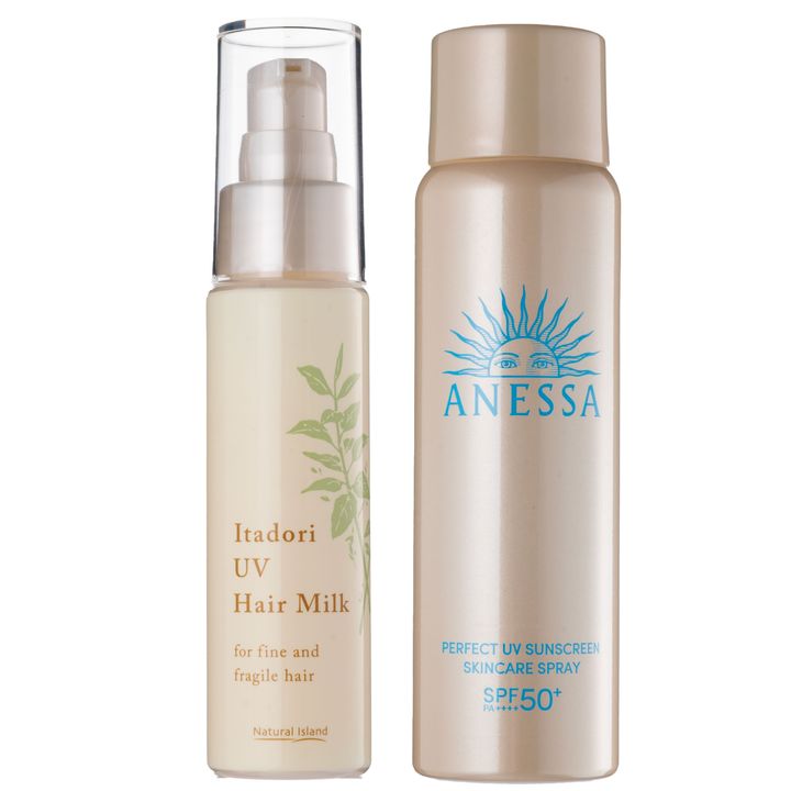 (左から)活性酸素を除く独自エキス配合。イタドリUVヘアミルクSPF16・PA+++ 56ml ¥2,860(ナチュラルアイランド)、アネッサ パーフェクトUV スキンケアスプレー NA SPF50+・PA++++ 60g¥1,958(編集部調べ、資生堂)