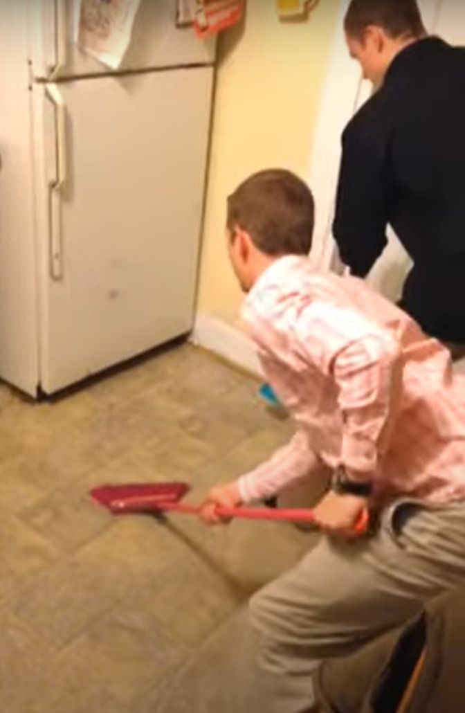 ネズミを捕まえるはずが、男性たちは思わぬハプニングで床掃除をする羽目になってしまったようです。