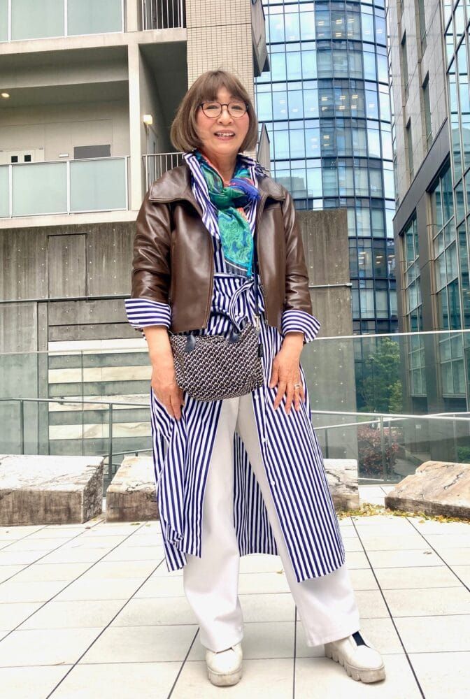 スタイリストとして活躍されていた経歴を持つ木村さんは、ストライプのシャツワンピースの着こなしも一味違ったこなれ感を出し、目を引く存在感がありました。「ストライプやマリンルックが好きなので、今日はシャツワンピースを主役にした着こなしに。『ジャンルイシェレル』のレザージャケットを合わせることで、爽やかさにかっこよさを加えたスタイルにしました」。帽子や首まわりの巻き物でスタイリングにアクセントをつけることが多いという木村さん。「スカーフはアクセサリー感覚でプラス。首元にあるとこれだけで華やかさが増します」