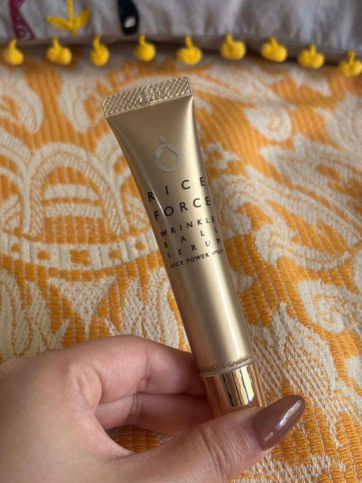 K・M:私も今までそうだったんだけど、メイクの上からするとシワを改善してくてハリに変えてくれるの。いろいろアイクリームの中でもライスフォースがオススメ。これはライスパワーNo.11+が配合されている、薬用シワ改善美容液なの。ライスパワーっていうのは“水分保持能改善”効果に加えて、“シワ改善効果”が認められた、ダブル改善効果を備えられたエキス。塗る部分にはボールがついていて、チューブ本体を押すとセラムが出てきて塗布すると本当に気持ちいいの。