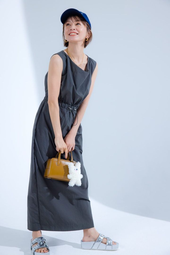 さらりと着られて頼れるカーキ色の夏ワンピは気負わず手に取れる一枚。だからこそ、ラフさの中にアクセサリーで品を添えて格上げするのがポイント。さらにチャームで遊び心を、キャップで抜け感をプラスすることで、シンプルだけどちゃんと印象に残る——そんな夏スタイルが完成します。