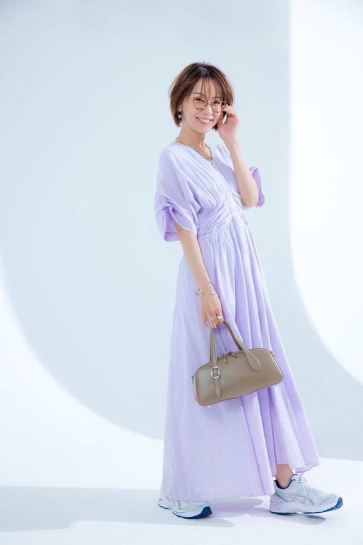 ライラックカラーが目をひく夏ワンピ。ほんのり甘く歩くたびに揺れるフレアが可愛いワンピースには、スニーカーでカジュアルに外し大人の余裕を。仕上げにパールとシルバーのレイヤードで涼感をプラスした〝洗練夏ワンピ〟スタイルです。