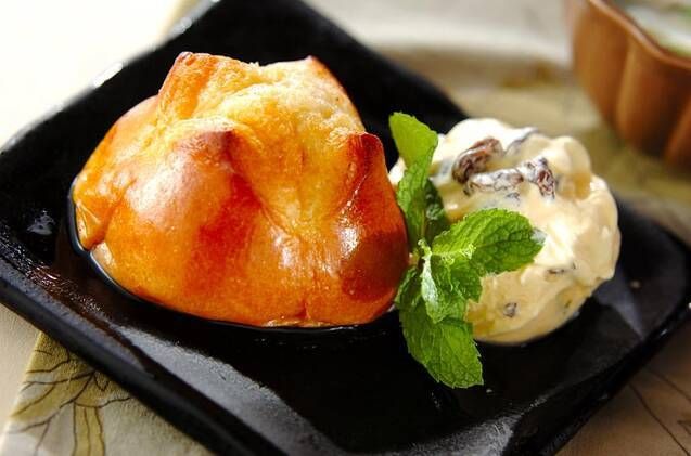 フランスの大人向けスイーツ「サバラン」。ブリオッシュに、ブランデーなどの洋酒をしみ込ませてアイスを添えます。使用するお酒はブランデー以外にラム酒でも◎。