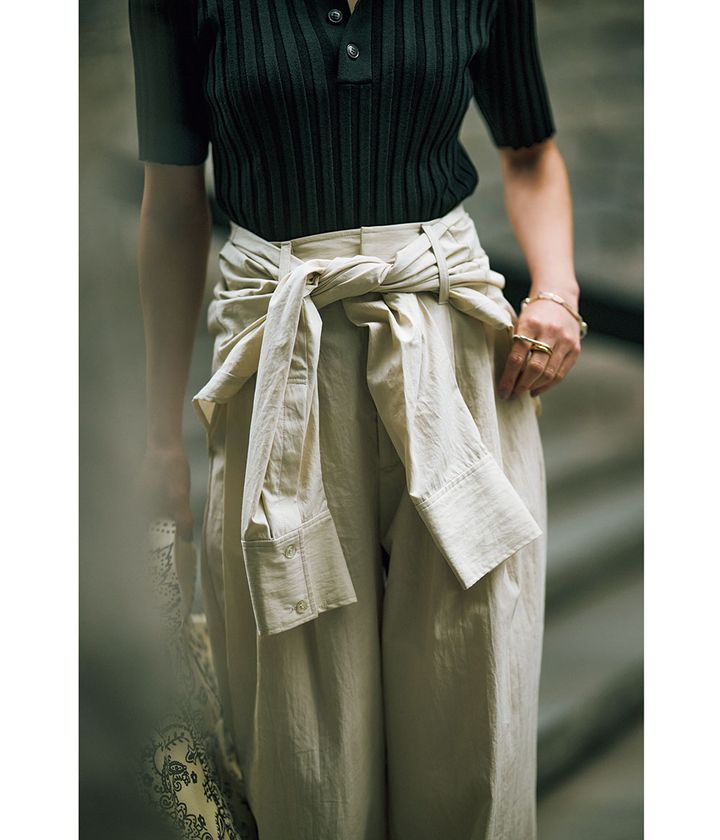 シャツベルトパンツ¥11,550(スタイルミキサー)ポロニット¥27,500(ハイク/ボウルズ)バッグ¥37,400(ヴァジック/ヴァジックジャパン)ペイズリー柄トートバッグ¥26,400(マニプリ)帽子¥17,600(メゾンドリリス)パンプス¥79,200(ペリーコ/アマン)ピアス¥33,000ブレスレット¥35,200(ともにブランイリス/ブランイリス トーキョー)リング[右手]¥50,600(プラウ)リング[左手]¥4,950(loni)