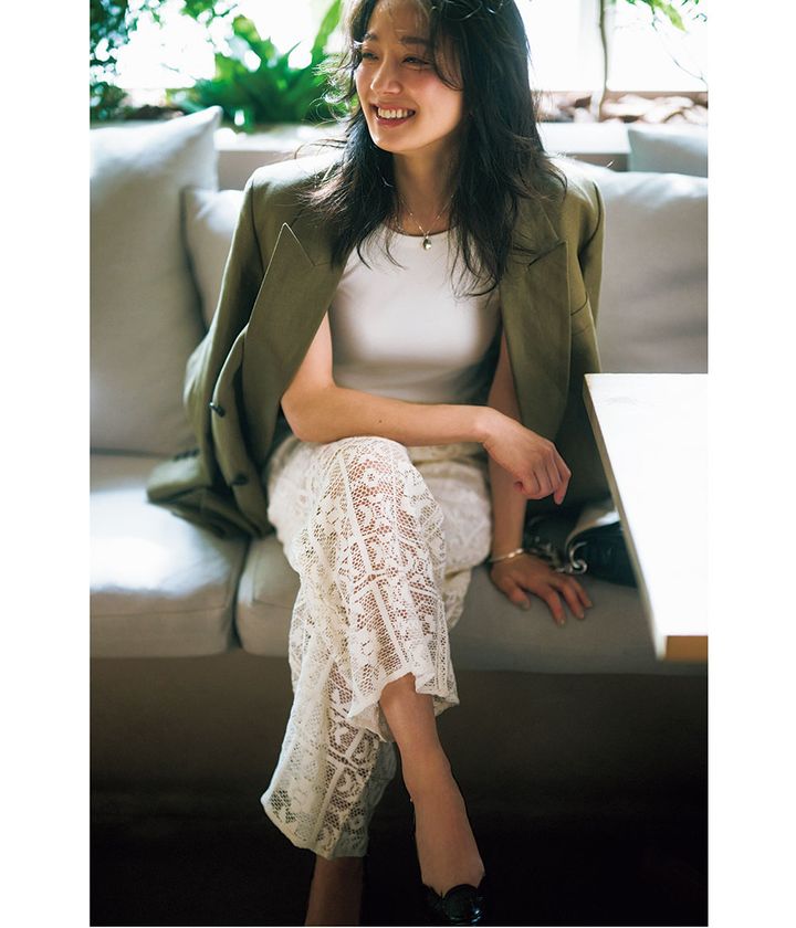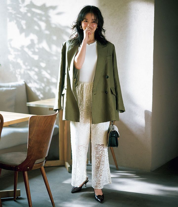 レース効果で華やぎと柔らかさを醸し出す。甘さ全開のパンツがジャケットスタイルにちょうど良い。