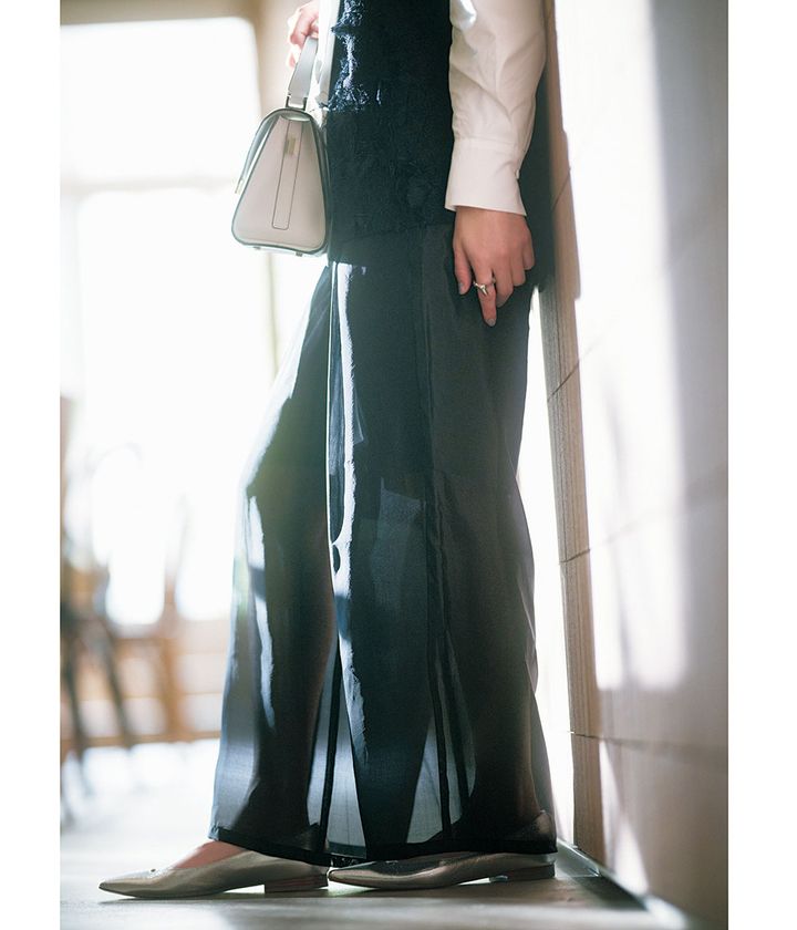 シアーパンツ¥48,400(チノ/モールド)中に着たハーフパンツ¥10,450(ノーク)ベスト¥24,200(カデュネ)ボウタイブラウス¥33,000(サードマガジン)バッグ¥594,000(ヴァレクストラ/ヴァレクストラ ジャパン)パンプス¥69,300(ペリーコ/アマン)イヤリング¥33,000リング¥33,000(ともにブランイリス/ブランイリス トーキョー)