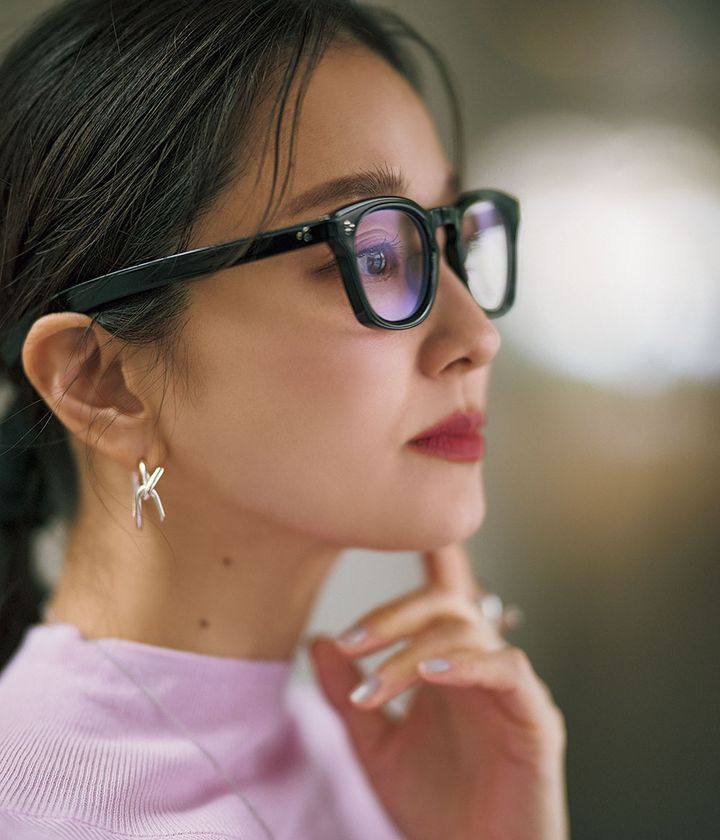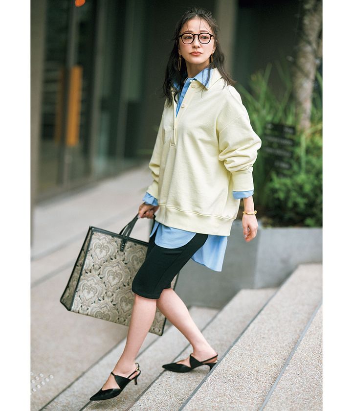 レギンスハーフパンツ¥26,400(アドーア)スウェット¥29,700(カオス/カオス丸の内)シャツ¥41,800(コラム/エストネーション)バッグ¥71,500(ア ヴァケーション/ノーベルバ)パンプス¥66,000(ネブローニ)メガネ¥38,500(ブラン/ライト)ピアス¥34,980バングル¥34,980(ともにソコ/ズットホリック)ネックレス¥13,200(Pearl for Life/ロードス)