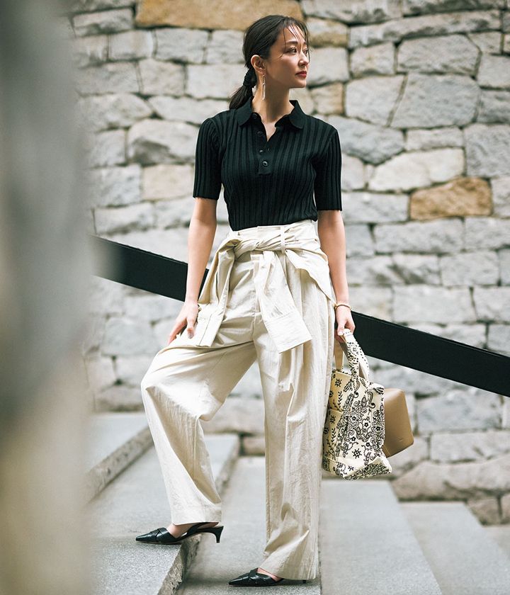 落ち感あるパンツで膝下も映える。ウエストやヒップの気になる部分をカバーしつつ適度な肌見せで抜け感を。