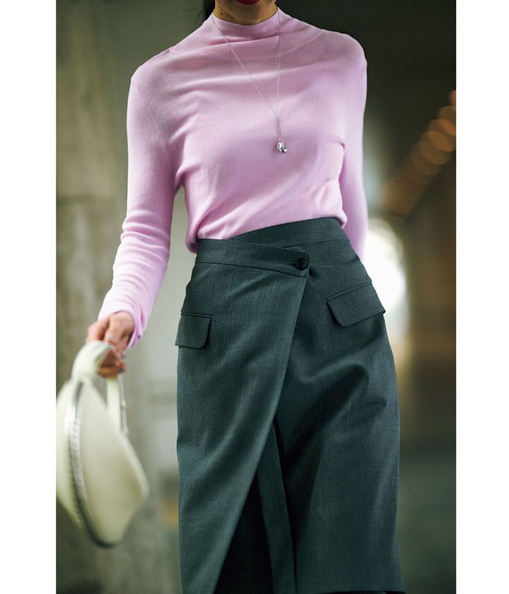 ラップスカート¥39,600パンツ¥41,800(ともにチノ/モールド)ニット¥13,200(カデュネ)バッグ¥165,000(J&M デヴィッドソン/J&M デヴィッドソン カスタマーセンター)パンプス¥19,250(ジネス/チアキカタギリ/ジオン商事)メガネ¥40,700(ブラン/ライト)ピアス¥31,900(ブランイリス/ブランイリス トーキョー)ネックレス¥7,920(アンタイトル)リング[右手]¥3,900(soie/ロードス)リング[左手]¥27,500(バルブス/ズットホリック)