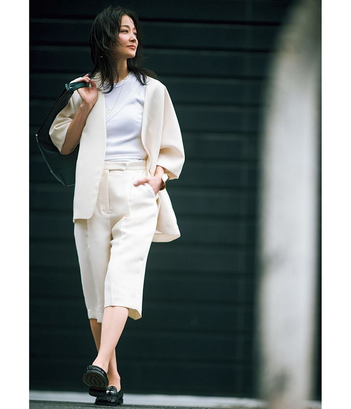 年齢を重ねてくると自分の体型や似合うスタイルが分かるようになり、それを活かしてオシャレを楽しんでいる人がより一層素敵に映ります。大人のハーフパンツは難しいけれど、気になる部分を上手にカバーしつつ、今の自分にフィットする旬のスタイルで送迎するのが私の理想。合わせる小物まで計算し、全体のバランスを意識してハーフパンツスタイルを極めたいです。(モデル・中越典子さん)