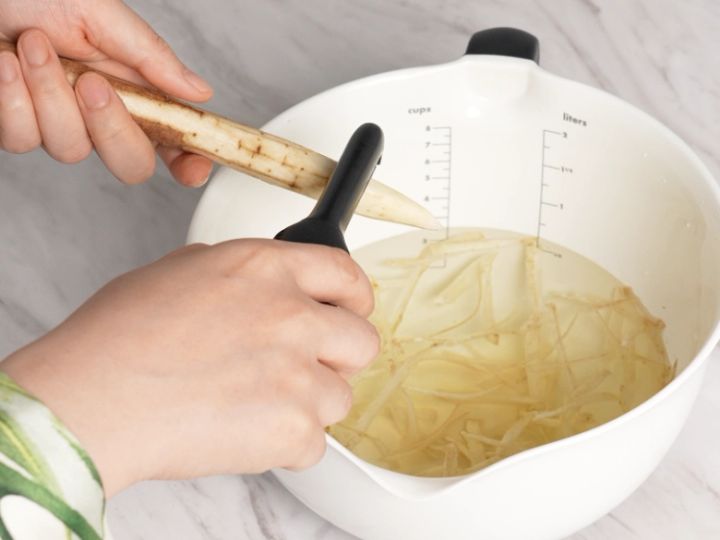 シャープでよく切れるステンレスの刃なので、ごぼうの皮をこそげるのも、ささがきもコレ1本で簡単。