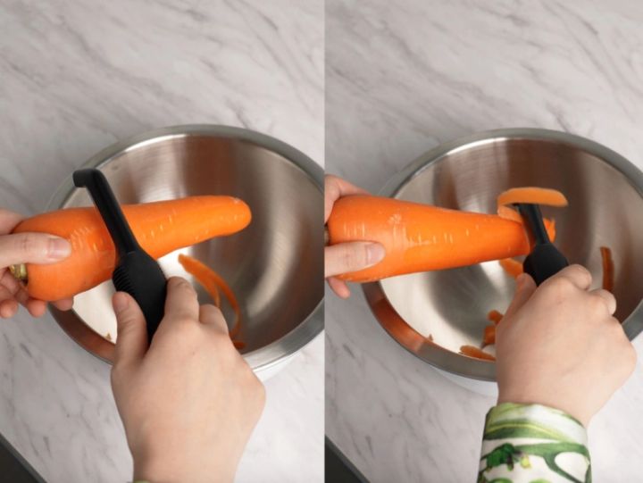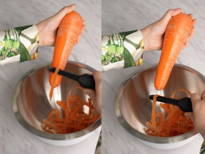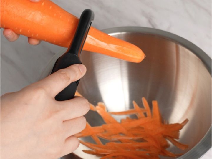 『O X O(オクソー) タテ型ピーラー』はタテ型なので、カッターで鉛筆を削るような感覚で、にんじんの実を削り切りして、キャロットラペもあっという間に完成。