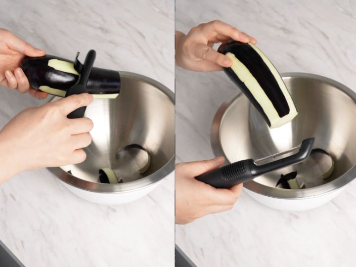 料理が苦手なパパには包丁デビューの前に、ピーラーデビューを!皮剥きだけでなく、食材の下ごしらえも一緒に家事参戦。デビュー戦におすすめなのはカフェみたいなナスのしましま剥き。ちょっと手間をかける愛が、料理を通じて家族に伝わります。