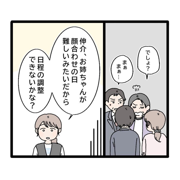 「大丈夫じゃないじゃん」夫に相談するも姉不在の顔合わせを義母に責められ唖然。嫁いびり義母|ママ広場マンガ