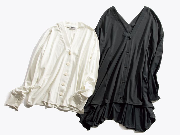 ・デコルテの開きが秀逸&程よく広がるシルエットで体型カバーにも一役。ブラックカーディガン¥31,900(LE PHIL)