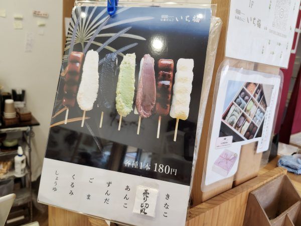 「仙臺だんご いち福」のこだわり串だんごは、「しょうゆ、くるみ、ごま、ずんだ、あんこ、きなこ、焼き」の7種類(全種類180円)ありますが、私が訪れた際には既に「焼き」が完売。ここからも人気店であることが伺えました。