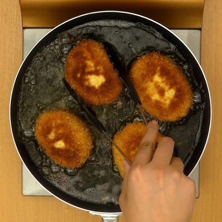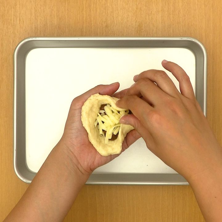 3.手のひらにサラダ油(分量外:適量)をぬり、生地1/4量をのせて丸め、1cmの厚さになるように平らに広げてじゃがカレー、ピザ用チーズをのせ、生地と生地をつまみながら包み、楕円形にととのえる。同様に計4個作る。溶き卵、パン粉の順にまぶす(カレーパン)。