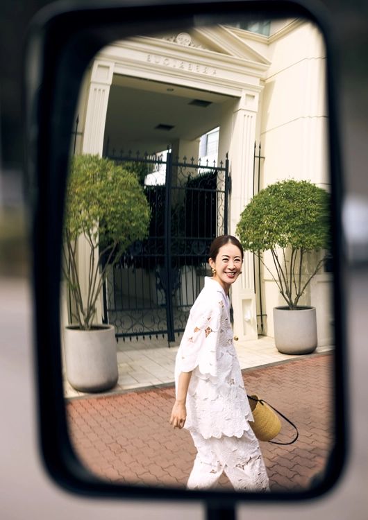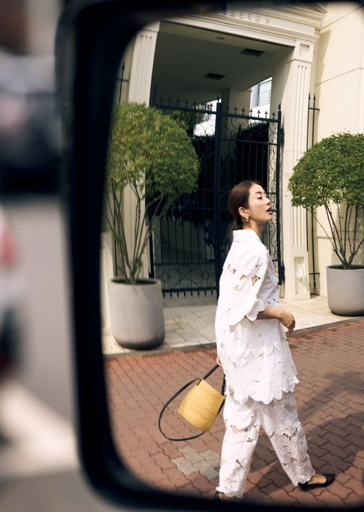 大柄のカットワークが目を引くパンツセットアップ。ブラウスはゆるりとしたオーバーサイズで、全身レースでも印象はエフォートレス。