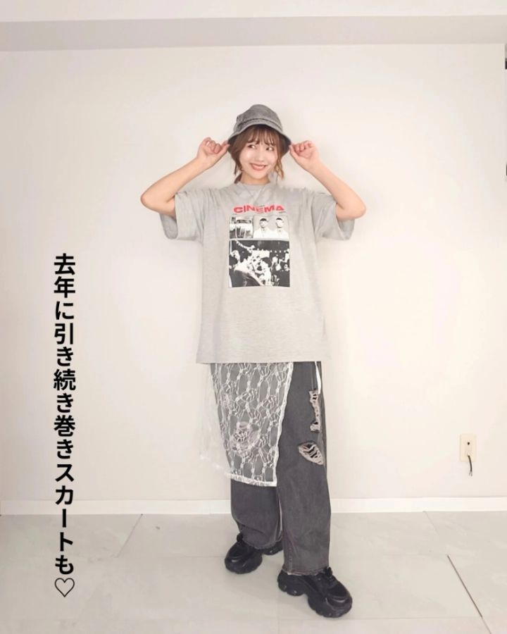 @tomos_dailyさんは、ゆったりサイズのTシャツに、最新トレンドとして注目を集めているレースアイテムをプラス!Tシャツにはレトロな映画のワンシーンがプリントされていて絶妙な雰囲気に。