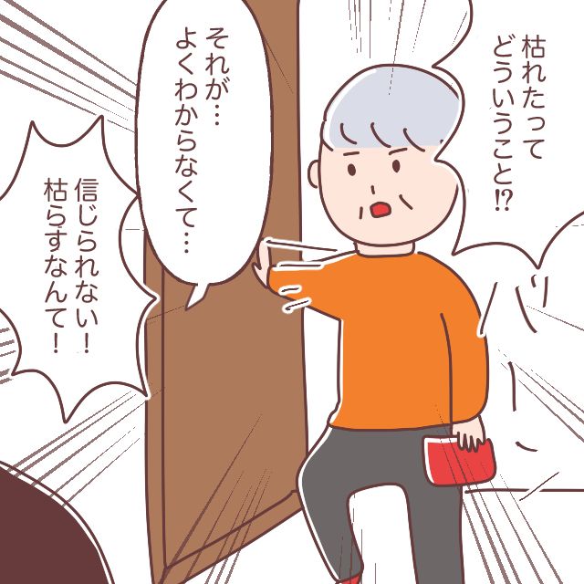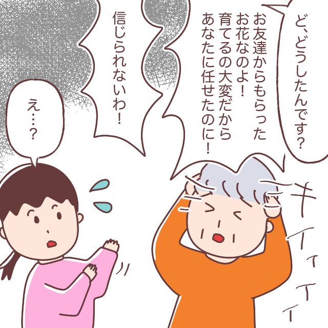 「ど、どうしたんです?」という私の言葉に思わず漏らしてしまった義母。「お友達からもらったお花なのよ!育てるの大変だからあなたに任せたのに!信じられないわ!」