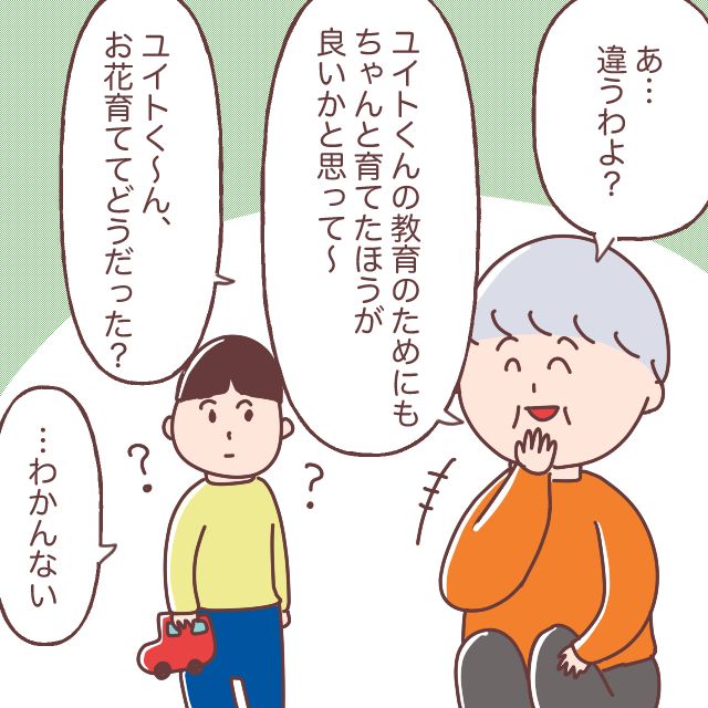 「あ・・・違うわよ?」と急に笑顔になって「ユイトくんの教育のためにもちゃんと育てた方が良いかと思って~。」と孫想いのおばあちゃんを演じ始めました。「ユイトく~ん、お花育ててどうだった?」とユイトに声をかけますが、ユイトは不思議そうに「わかんない。」と答えました。