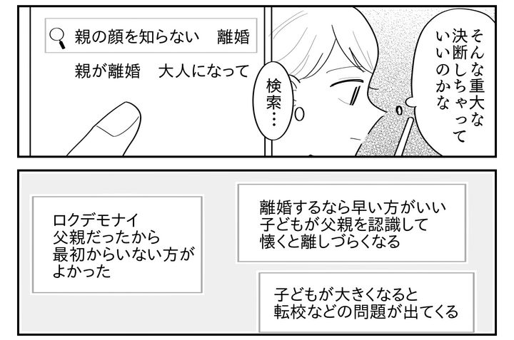 幸い仕事復帰は決まっているし、実家へ戻って両親に手助けしてもらえるなら生活はどうにかなるでしょう。けれど息子にとって父親を知らずに育つのはいいことなのかどうか……。そんなことを考えながら私はスマホで検索します。
