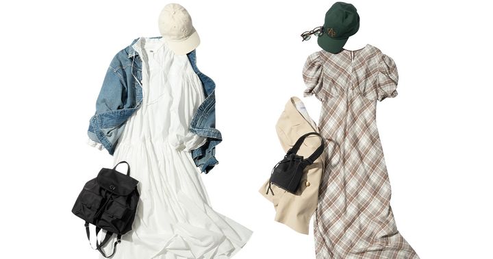 キャップ¥10,890(ヤヌーク/カイタックインターナショナル)ワンピース¥28,600(HER.)デニムジャケット¥49,500(ニードバイヘリテージ/ゲストリスト)バックパック¥27,500(コール ハーン/コール ハーン ジャパン)サンダル¥9,900(チャールズ&キース/チャールズ&キース ジャパン)