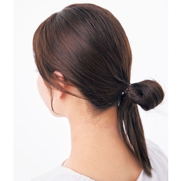 3.結んだ先の毛束をゴムに巻きつけ、中間部分をゴムに入れ込んで留めます。毛先はしまい込まずに引き出します。